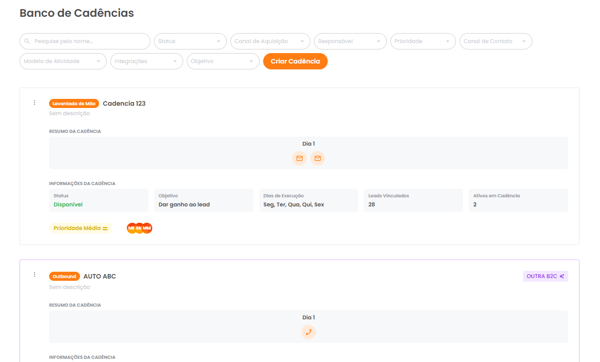 2°passo: No Banco de Cadências, crie ou edite a cadência que deseja configurar o número do WhatsApp Business.