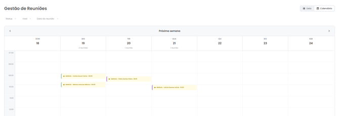 3° passo: Na página de "Gestão de Reuniões" busque pela reunião que deseja editar. Você pode utilizar uma das visualizações da página e o filtros para identificar a reunião que deseja editar.