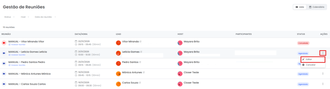 Através do GS Engage é possível editar informações de reuniões agendadas como data e horário das reuniões e participantes. Essas edições podem ser realizadas através da página de Gestão de Reuniões ou da página do lead específico.