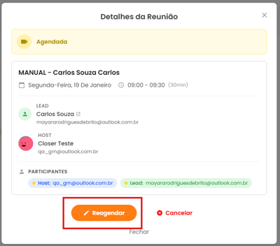 4° passo: No modal de Detalhes da Reunião, clique em "Reagendar" para iniciar a edição das informações da reunião.