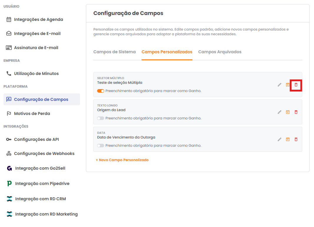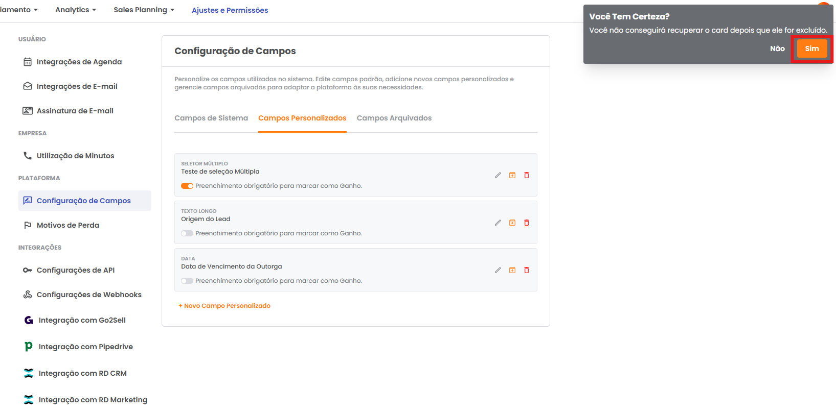 Os campos personalizados excluídos não podem mais ser acessados e deixarão de ser exibidos nas informações dos leads cadastrados.