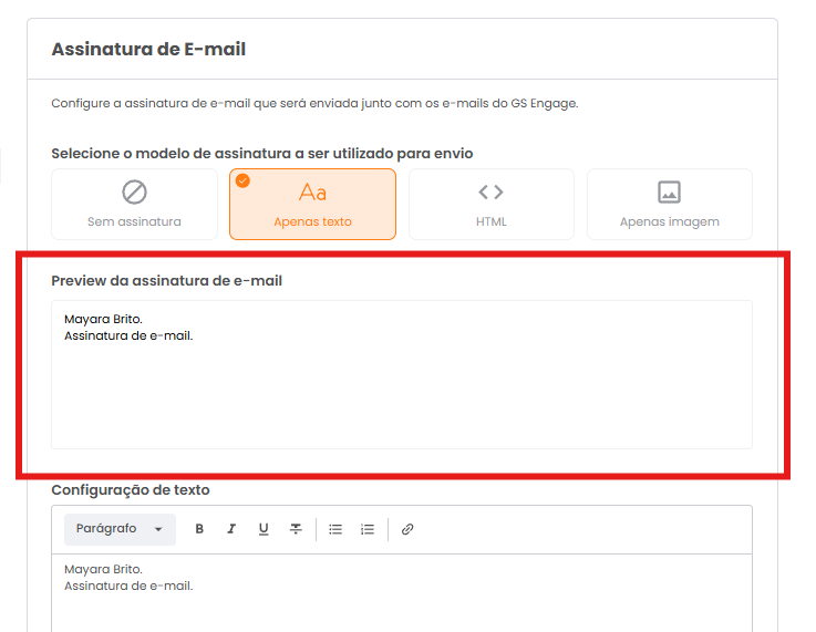 - Página de Assinatura de E-mail: Através desta página, é possível conferir como a assinatura será exibida nos e-mails enviados.