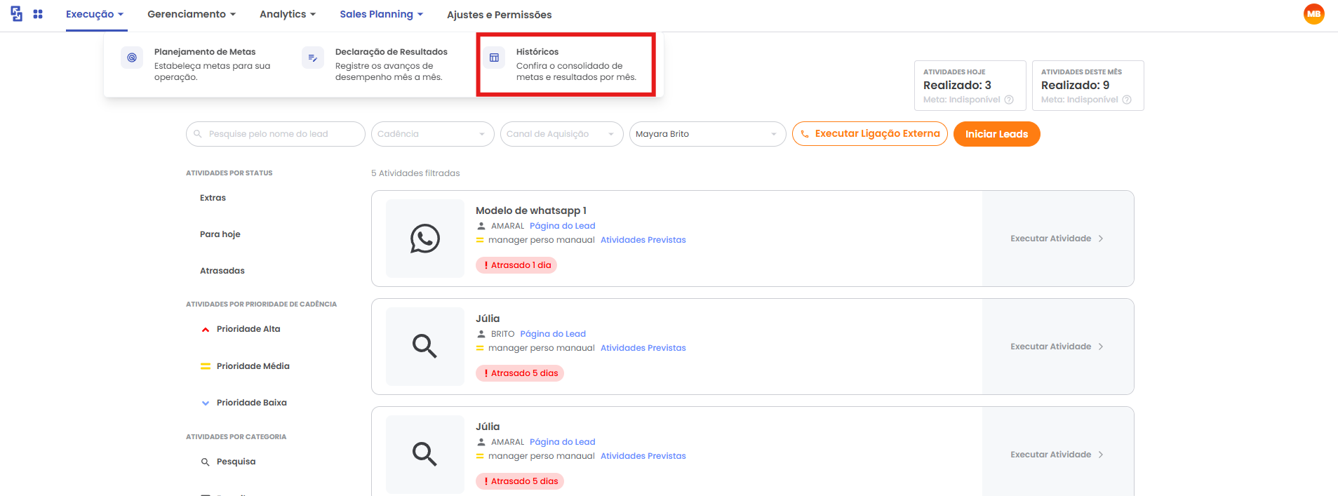 A página de Histórico de Metas e Resultados apresenta as informações relacionadas às metas planejadas e aos resultados declarados de sua operação. Esta página é um componente essencial para o acompanhamento mensal dos objetivos e desempenho do processo comercial.