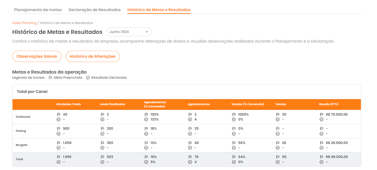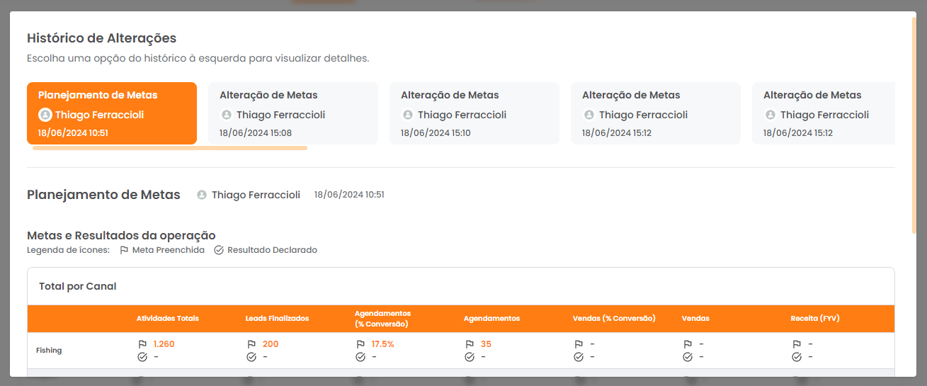 4° passo: Clique no botão “Histórico de Alterações” para visualizar todas as alterações realizadas no planejamento de metas e declaração de resultados do mês selecionado.