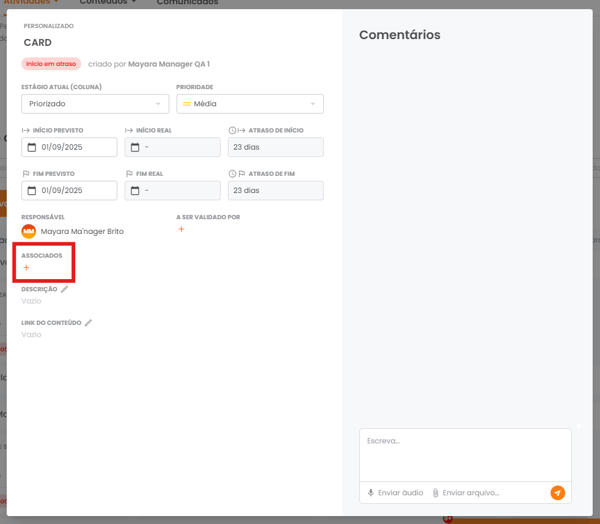 Os usuários associados a um card são aqueles que, apesar de não serem responsáveis pela realização das atividades, podem auxiliar o usuário responsável durante a execução ou precisam estar cientes dos avanços. A associação de usuário a uma atividade pode ser realizada após a criação do card das faixas de Evolução e Marco de Sucesso. Esta associação ocorre de maneira manual.
