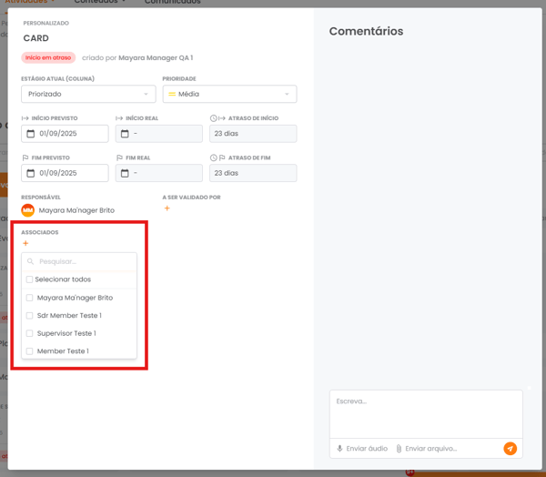 Os usuários associados a um card são aqueles que, apesar de não serem responsáveis pela realização das atividades, podem auxiliar o usuário responsável durante a execução ou precisam estar cientes dos avanços. A associação de usuário a uma atividade pode ser realizada após a criação do card das faixas de Evolução e Marco de Sucesso. Esta associação ocorre de maneira manual.