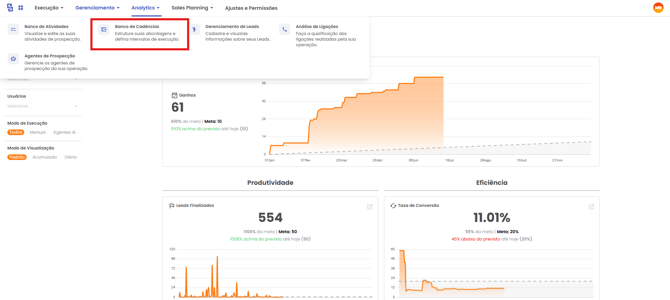 Na página de Banco de Cadência é possível criar as cadências de prospecção de leads que serão implementadas pelos SDRs de sua empresa. É importante ressaltar que apenas usuários com perfis de acesso de mentor ou manager têm permissão para criar novas cadências.
