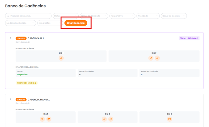 3° passo: Na página do Banco de Cadências, clique em “Criar Cadência”.