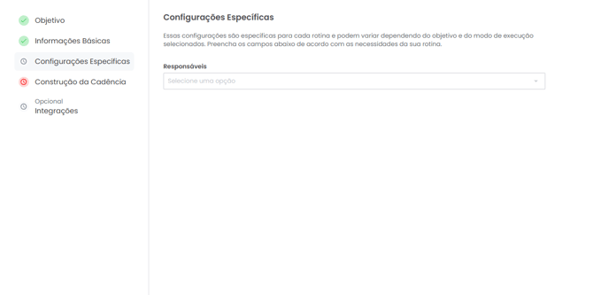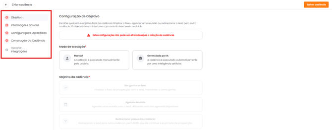 4° passo: Ao acessar a tela de criação de cadências, na seção a esquerda, você poderá navegar pelas seções de informações associadas à cadência. As seções são segmentadas em: Objetivo, Informações Básicas, Configurações Específicas, Construção da Cadência e Integrações.