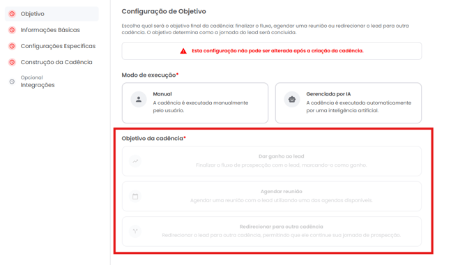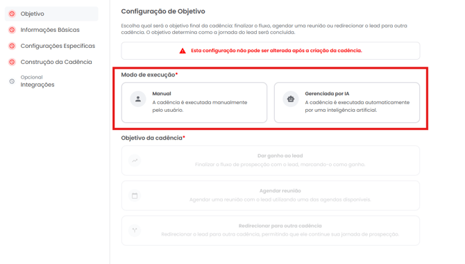 5° passo: Na seção de Objetivo, é possível escolher o modo de execução e o objetivo da cadência. Os modos de execução são divididos em Manual ou Gerenciada por IA.