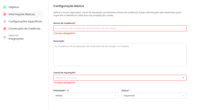 6° passo: Na seção de Informações Básicas, devem ser preenchidas as informações associadas a cadência como Nome da Cadência, Descrição, Canal de Aquisição, Prioridade e Status.