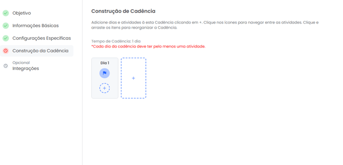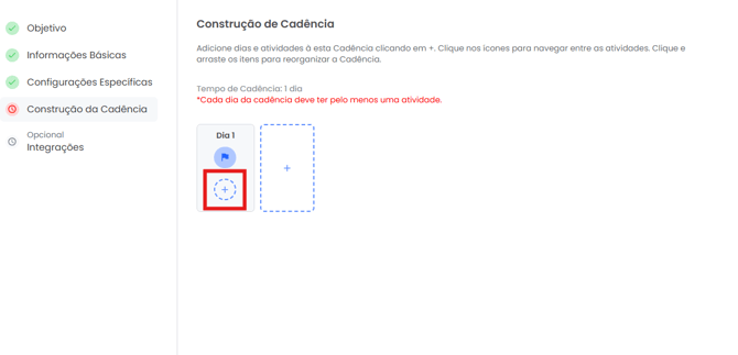 8° passo: Na seção de Construção da Cadência, você poderá configurar quantos dias terá sua cadência e adicionar as tarefas que serão feitas em cada dia.