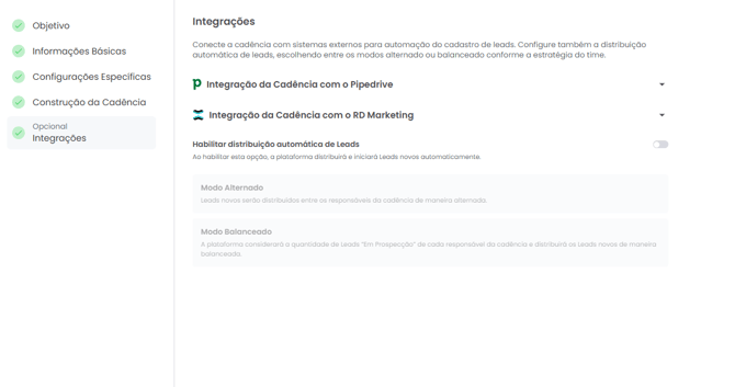 A seção de Integrações é opcional, nesta seção é possível configurar as integrações com Pipedrive e RD Marketing. Além disso, é possível configurar o modo de distribuição de lead.