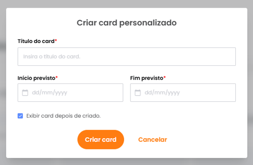 3° passo: Preencha os campos obrigatórios de Título do card, Início previsto e Fim previsto com as informações referentes a atividade que deseja criar.
