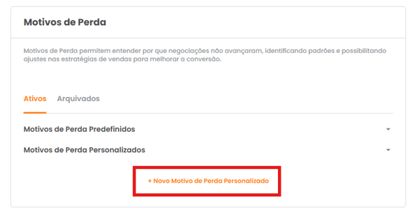 3° passo: Clique no atalho "+Novo Motivo de Perda Personalizado" para criar um motivo de perda personalizado ..