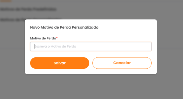 4° passo: No modal de criação de motivo de perda, preencha o nome do motivo de perda que deseja criar.