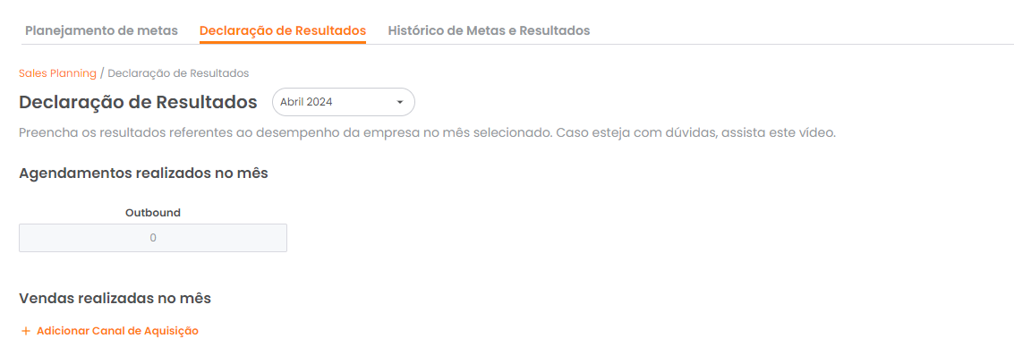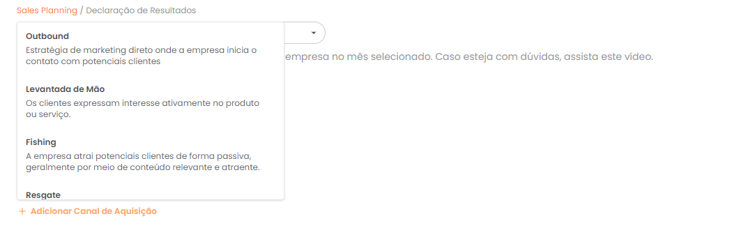 5° passo: Para declarar metas de vendas, clique no botão “+Adicionar Canal de Aquisição” e adicione os canais de aquisição desejados.