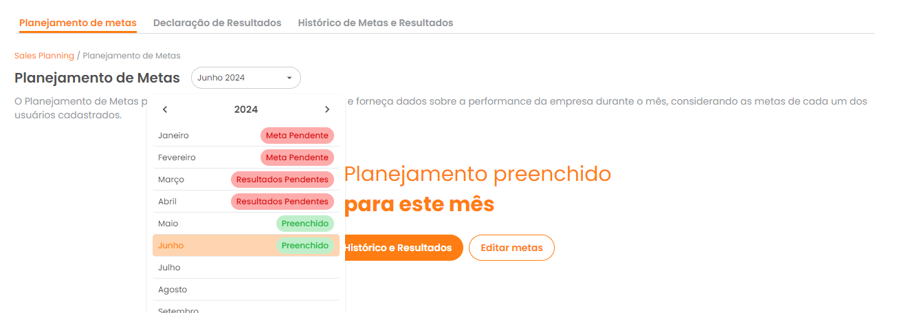 3° passo: No filtro da página selecione o mês que deseja realizar a edição do planejamento de metas.