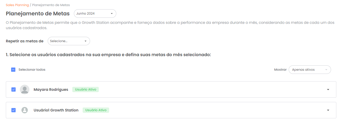 5° passo: Assim como ocorre no processo de planejamento de metas, é possível adicionar ou remover usuários do planejamento do mês, editar os canais de aquisição que serão trabalhados por cada usuário, as metas de pré-vendas e vendas.