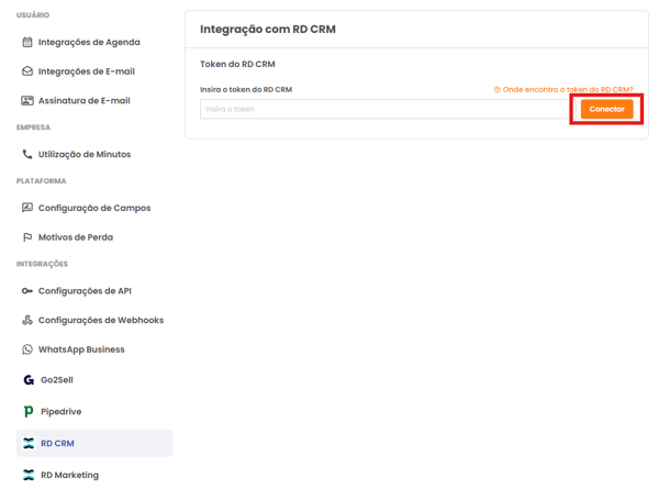 4° passo: Na página de configurações da integração com o RD Station CRM, informe o Token do RD CRM e, em seguida, clique em "Conectar".