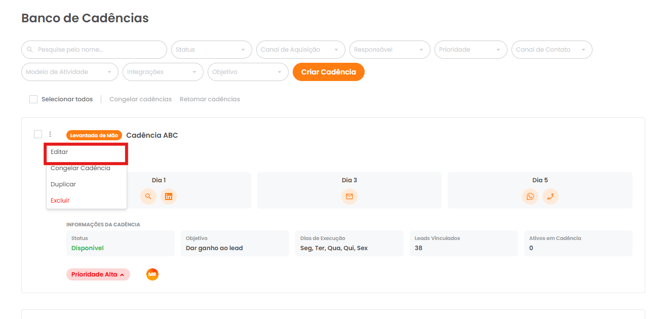 2° passo: Nesta página você poderá criar ou acessar as suas cadências de prospecção. Acesse o menu de ações da cadência de prospecção clicando nos 3 pontos, localizados do lado esquerdo do nome da cadência. No menu de ações selecione a opção “Editar”.