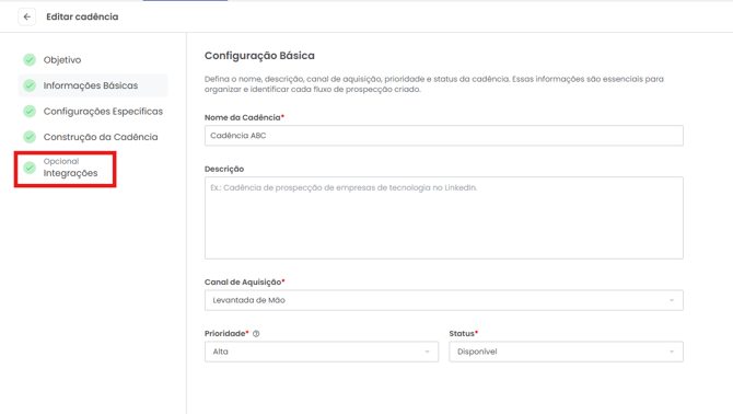 3° passo: Ao acessar as informações da cadência de prospecção, clique na aba “Integrações”.