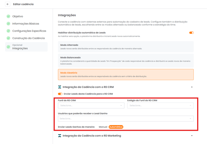 5° passo: Após habilitar a integração da cadência com o RD CRM, selecione o Funil e Estágio do RD CRM para os quais os leads serão enviados.
