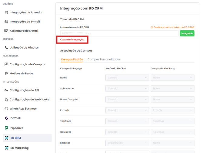 Para remover a integração com o RD CRM do GS Engage, siga os passos abaixo: