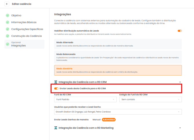 4° passo: Vá até a seção de "Integração da Cadência com o RD CRM" e habilite o switch “Enviar Leads desta Cadência para o RD CRM”.