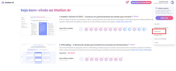 1° passo: Com o perfil logado, clique no ícone do seu perfil localizado no canto superior direito da página e selecione a opção “Segurança”.