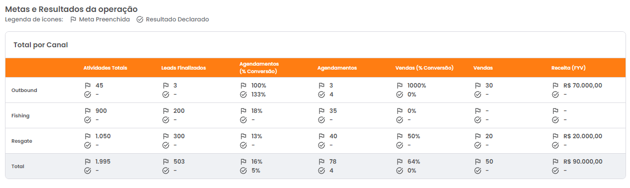 A seção de Metas e Resultados da operação apresenta as metas planejadas e os resultados declarados da sua operação no mês selecionado. As metas e resultados são segmentadas por canal de aquisição e exibidos com base nas seguintes categorias: Atividades Totais, Leads Finalizados, Agendamentos (%Conversão), Agendamentos, Vendas (%Conversão), Vendas e Receita (FYV).