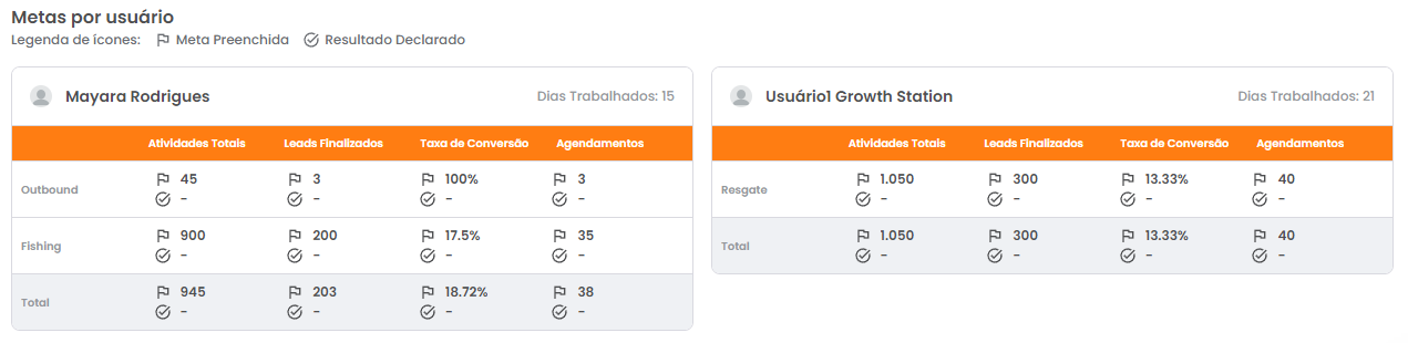 A seção seguinte apresenta as metas planejadas e resultados declarados de cada um dos usuários da sua operação no mês selecionado. Os valores apresentados nesta seção são segmentadas por canal de aquisição e exibidos com base nas seguintes categorias: Atividades Totais, Leads Finalizados, Agendamentos e Taxa de Conversão.