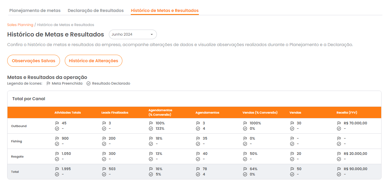 A página de Histórico de Metas e Resultados apresenta as informações relacionadas às metas planejadas e aos resultados declarados de sua operação. Esta página é um componente essencial para o acompanhamento mensal dos objetivos e desempenho do processo comercial.