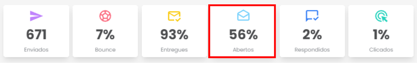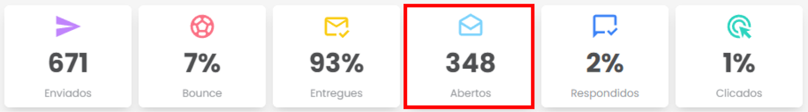 Ao acessar a página do dashboard de E-mails na parte superior é apresentado um resumo das métricas referentes a quantidade de e-mails enviados dentro do período avaliado e suas respectivas taxas de Bounce, Entregues, Abertos, Respondidos e Clicados.
