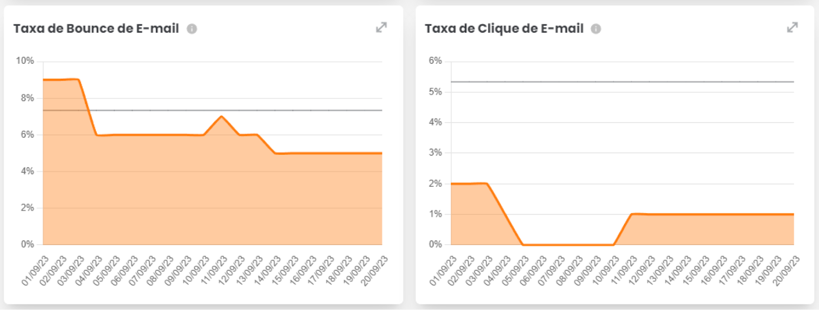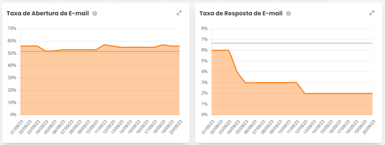 Nesta página também é possível visualizar as métricas associadas aos e-mails através de dashboards que exibem informações sobre as taxas de e-mail em relação ao tempo. Isso permite a análise do progresso de cada uma dessas taxas em comparação com as referências do mercado ao longo do período de análise.