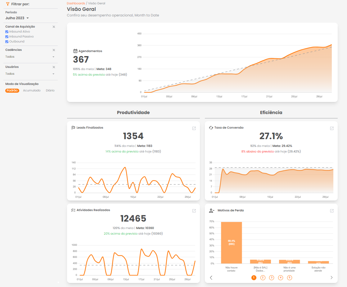 O modo de visualização Padrão da página de Visão geral combina as visualizações acumulado e diário. Ao acessar esta página o modo de visualização selecionado é o modo Padrão. Neste modo de visualização, os gráficos de Agendamento e Taxa de Conversão são exibidos a partir da visualização acumulada, apresentando a soma cumulativa dos dados de cada métrica. Os gráficos de Leads Finalizados e Atividade Realizadas são exibidos com base no modo de visualização diário, apresentando os dados associados a estas métricas segmentados por dia.