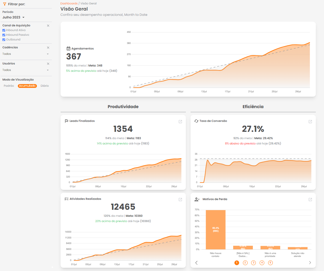 No modo de visualização Acumulado, os gráficos de Agendamentos, Leads Finalizados, Atividades Realizadas e Taxa de Conversão mostram a soma cumulativa dos valores de cada uma destas métricas dentro do período de análise selecionado, ou seja, cada ponto representa a soma de todos os valores anteriores do período até uma data selecionada. Esse tipo de gráfico é frequentemente utilizado para ilustrar a progressão total, a tendência ou a contribuição cumulativa ao longo do tempo.
