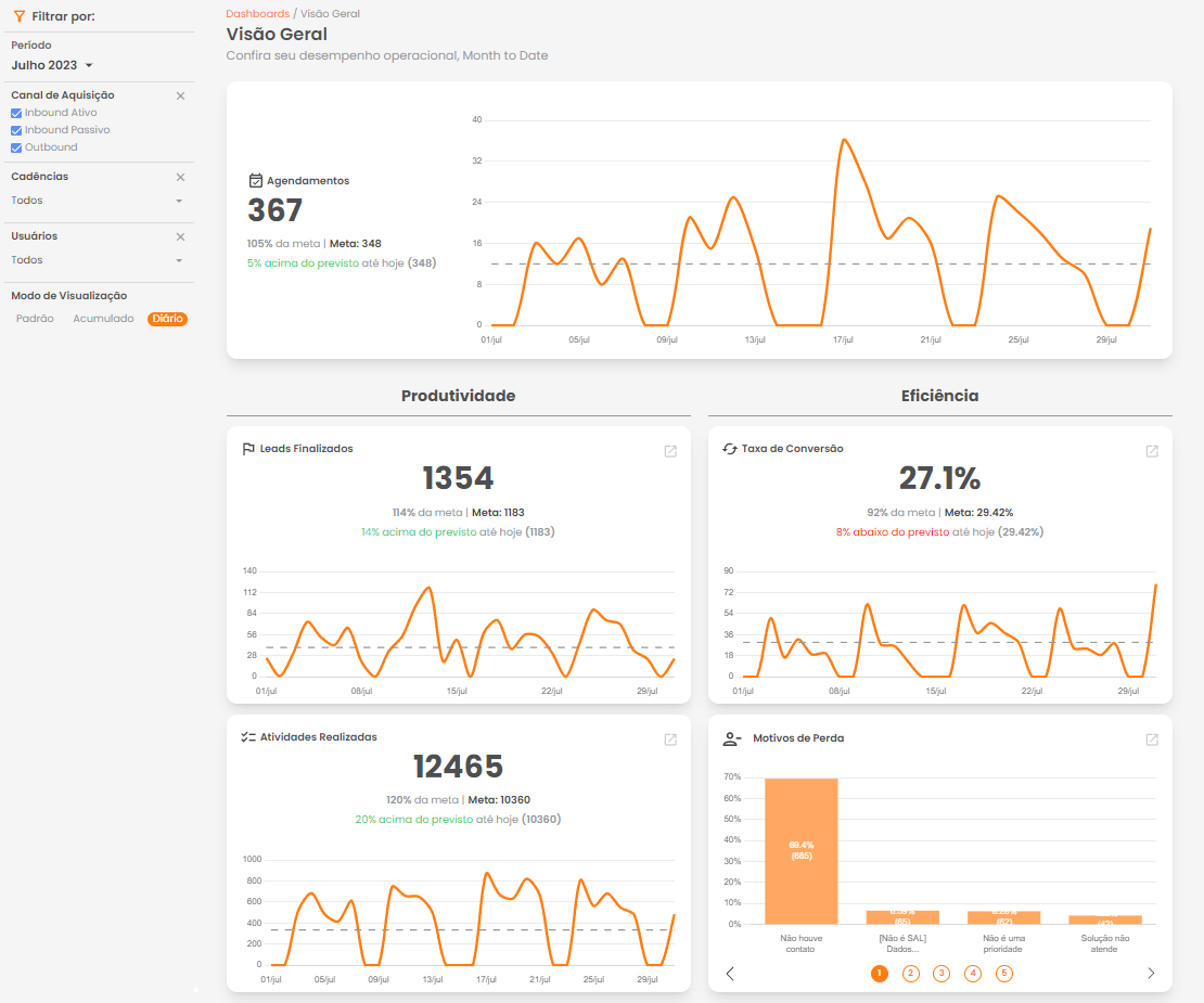 A página de Visão Geral fornece informações sobre o progresso da sua operação comercial, apresentando cinco gráficos que exibem dados relacionados às métricas de Agendamentos, Leads Finalizados, Atividades Realizadas, Taxa de Conversão e Motivos de Perda.
